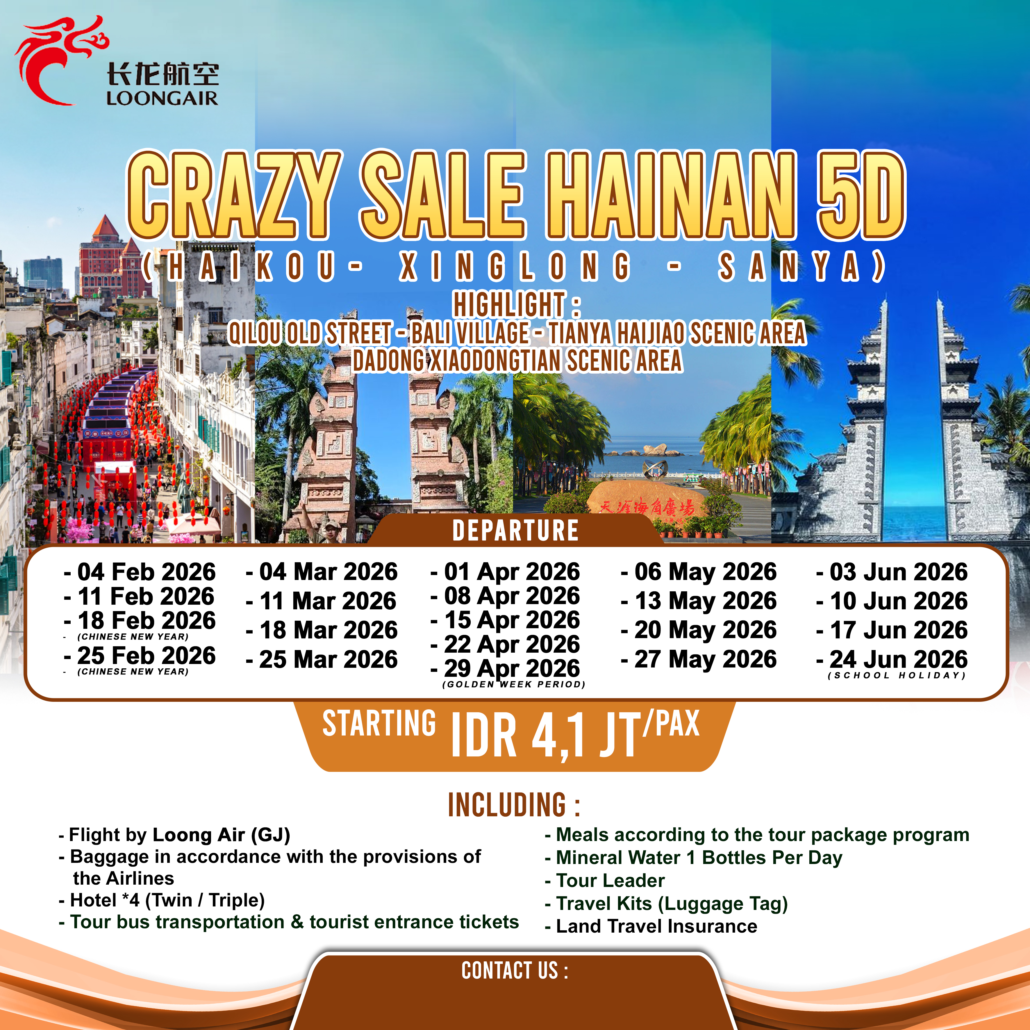 street 骑楼老街, Setelah makan siang, kita akan berangkat ke Xinglong dan mengunjungi Bali Village 巴厘村. Di sini, kita bisa mendengar musik yang meriah, menonton tarian yang memukau, serta mengalami budaya orang Indonesia yang kembali dan menetap di sini. Setelah makan siang, Anda akan melakukan tur berkeliling di wilayah hotel mewah Haitang Bay, kemudian menuju Pantai Yalong Bay untuk menikmati laut yang tak ada habisnya. Setelah itu, Anda akan check-in ke hotel di Sanya untuk beristirahat.