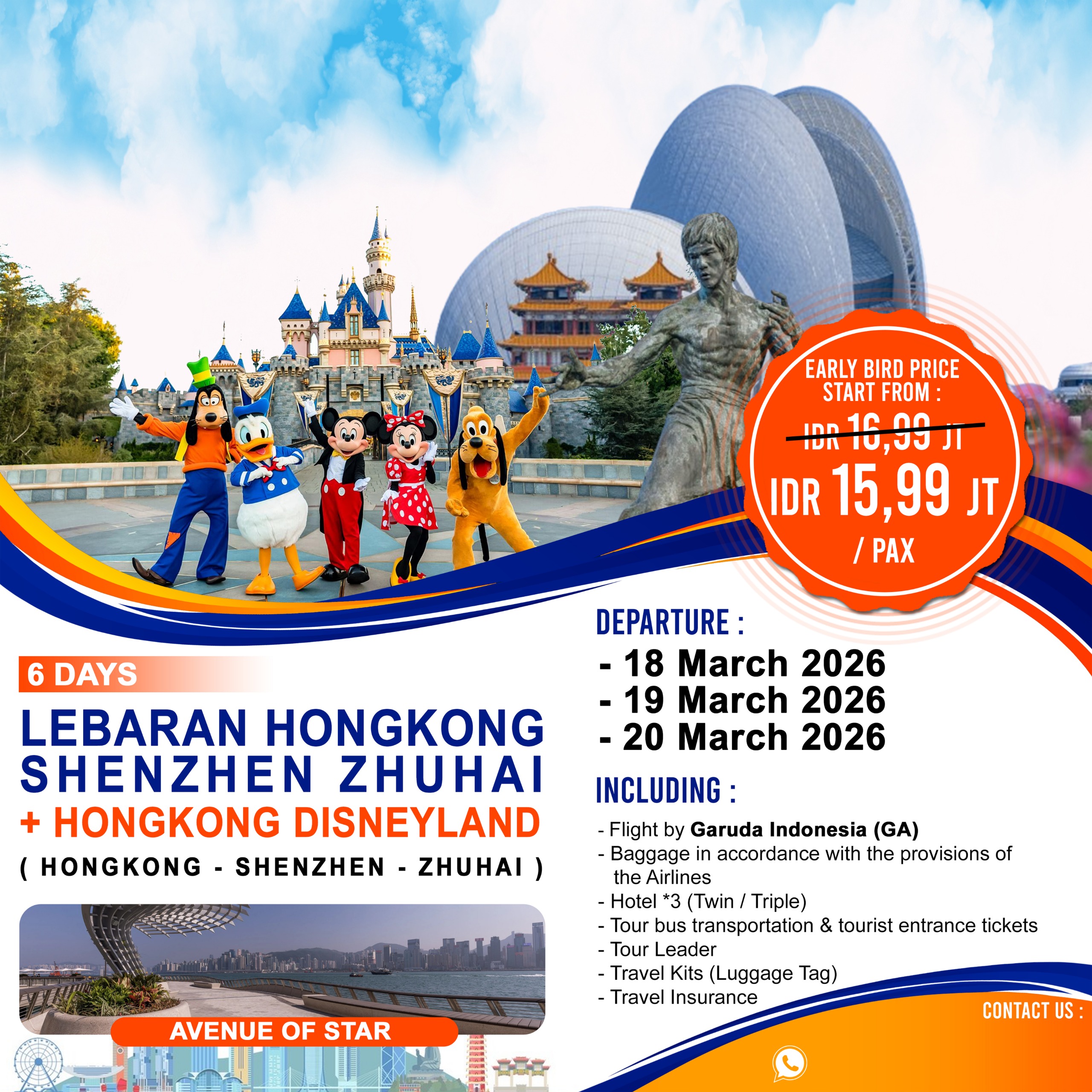Setelah sampai di Bandara Chek Lap Kok, Hongkong, kita disambut oleh Guide berbahasa Indonesia yang ramah, Setelah itu kita akan berkesempatan untuk mengunjungi Avenue of Star yang merupakan area tempat penghormatan kepada para seniman & selebritas Hong Kong. Lalu kita akan mengunjungi Victoria peak menggunakan tram (one way), gunung di Hong Kong, Tiongkok. Puncak tersebut terletak di bagian barat daya Pulau Hong Kong dengan ketinggian 552 meter. Setelahnya kita akan menuju Chocolate store untuk membeli cokelat Setelah itu kita akan menuju ke Shenzhen. Setibanya di Shenzhen, kita akan mengunjungi Luohu Commmercial city untuk berbelanja dan makan malam. lalu Check-in hotel istirahat.