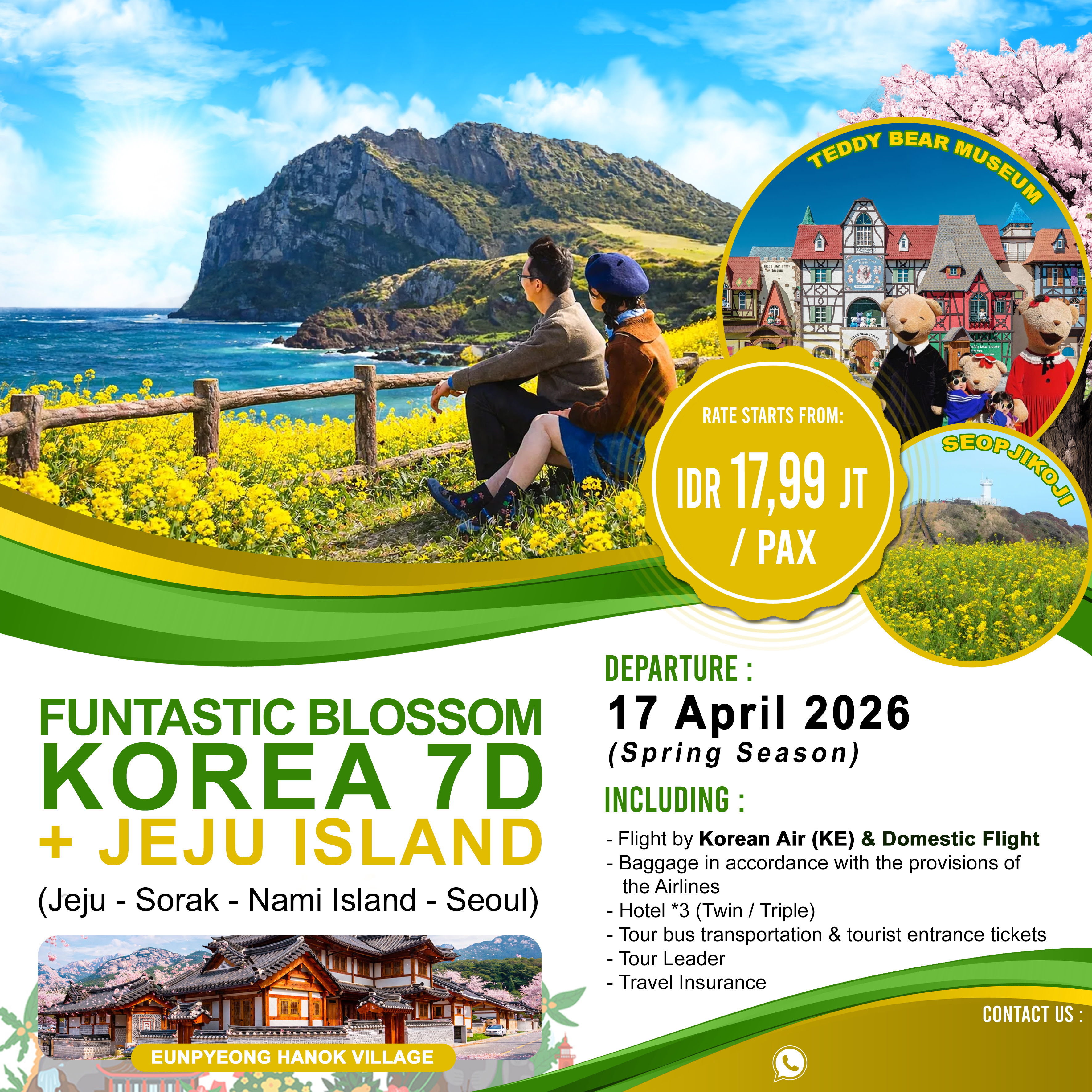 Sarapan pagi di hotel, lalu kita akan menuju Jeju airport, untuk menuju ke Seoul dengan pesawat domestic. Kita akan mengunjungi Eunpyeong Hanok Village, spot Sakura terbaik dengan panorama hanok village Korea, dilanjutkan menuju tempat yang terkenal dengan tempat syuting film winter sonata, yaitu Nami Island. Setelah itu kita akan menuju Gunung Sorak, Check-in Hotel Istirahat
