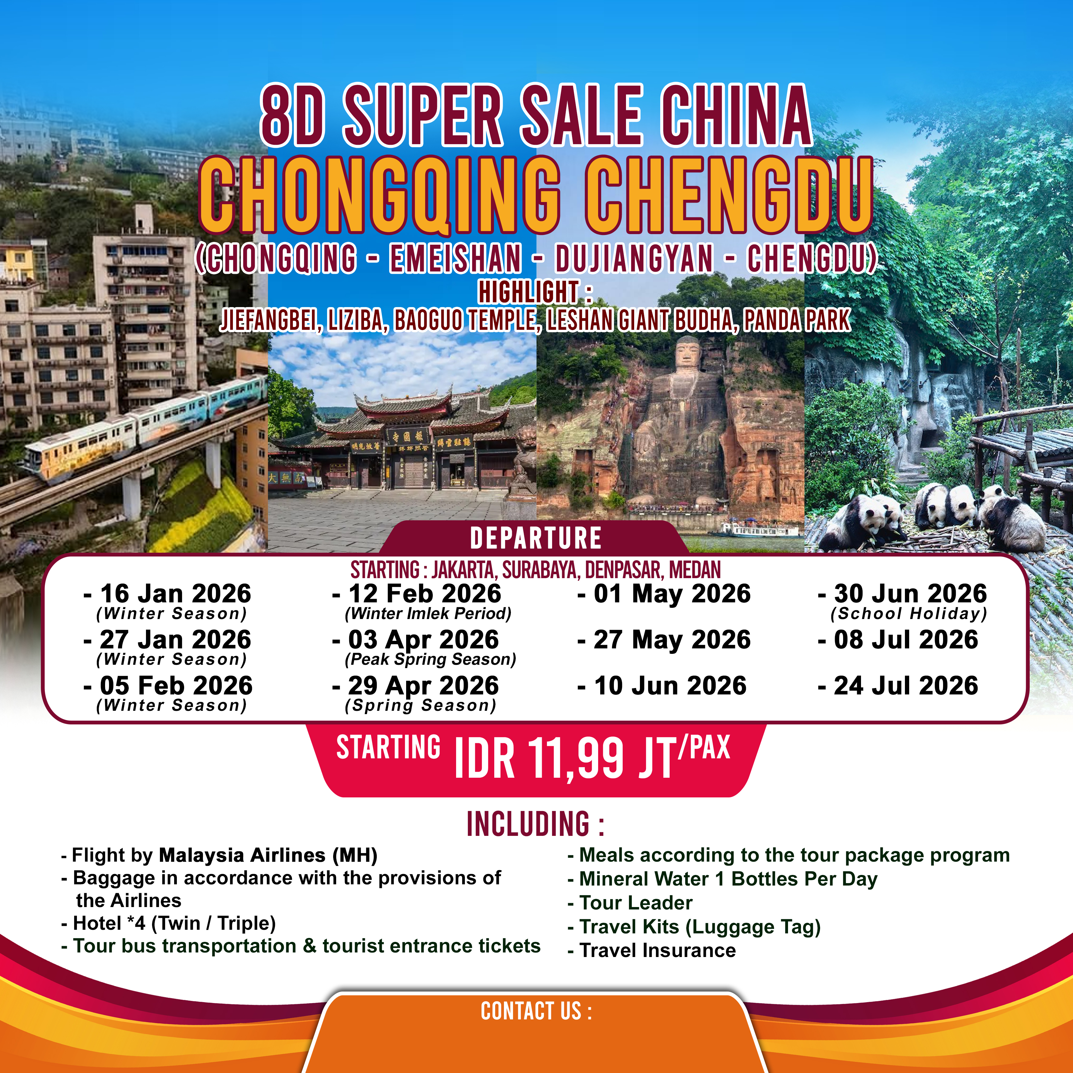 Sarapan pagi di hotel, Perjalanan diawali menuju Zhongshuge sebuah toko buku ikonik yang terkenal dengan desain interiornya yang unik dan artistik, cocok untuk menikmati suasana santai sambil mencari buku-buku menarik. Setelah itu, kunjungi Panda Yangtian Square, sebuah tempat yang ramai dan penuh kehidupan di pusat kota, dimana Anda bisa merasakan atmosfer lokal dan melihat patung panda ikonik yang menjadi simbol kota Chengdu. perjalanan dilanjutkan ke Guanxian Ancient City, sebuah kota kuno yang menawarkan pesona sejarah dan budaya tradisional yang kental, dengan bangunan berarsitektur klasik yang membawa Anda seolah kembali ke masa lalu. Kemudian, nikmati waktu di Jinli Ancient Street, jalan bersejarah yang dipenuhi dengan toko-toko suvenir, jajanan tradisional, dan pertunjukan budaya yang hidup, menjadikannya tempat yang sempurna untuk berburu oleh-oleh dan merasakan kehangatan budaya Sichuan. Selanjutnya kita akan menuju bandara untuk penerbangan kepulangan.