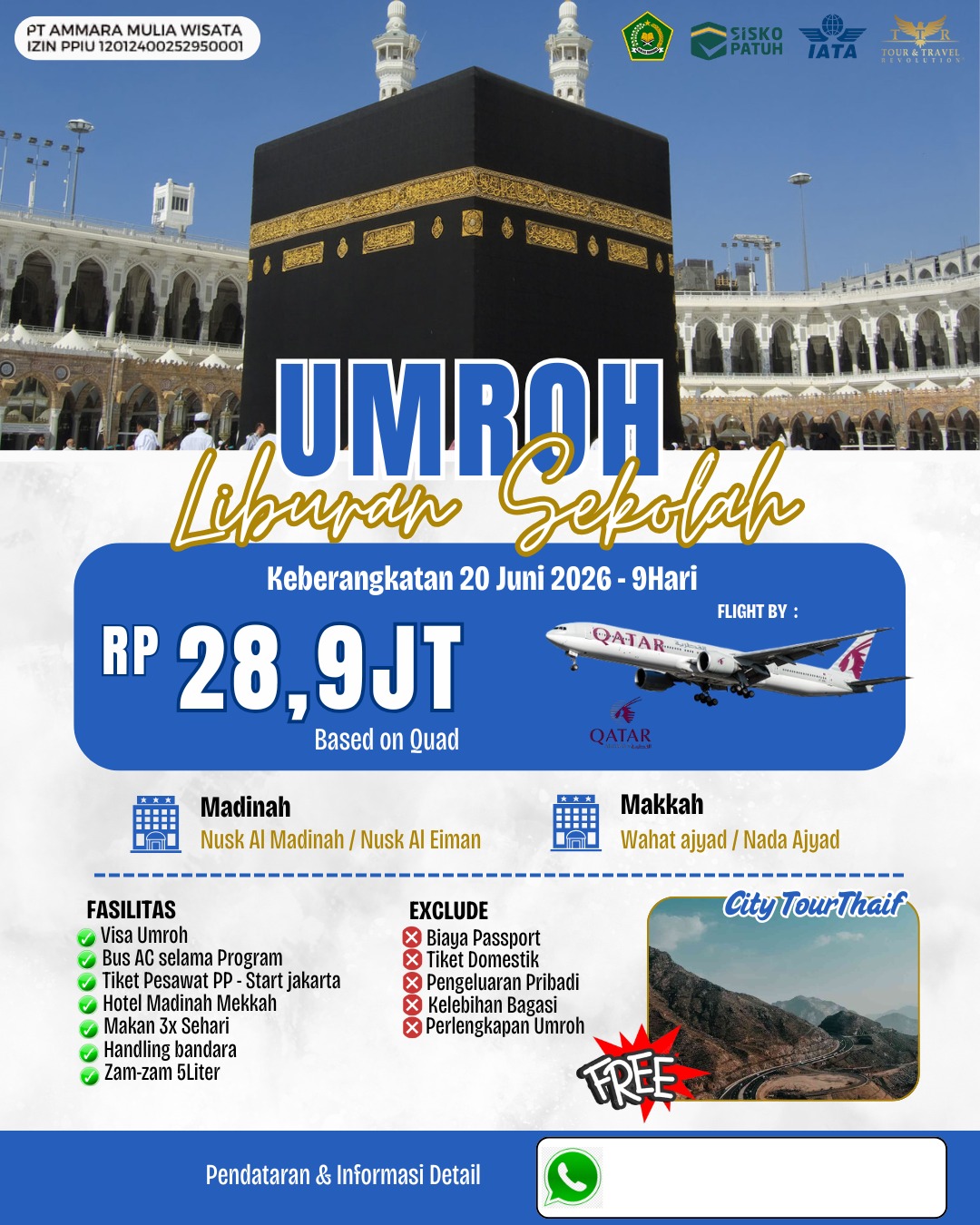 Flight : QATAR AIRWAYS Keberangkatan : 20 Juni 2026 ( 9 hari ) Harga Rp 28.900.000 / orang QUAD ROOM ( 1 Kamar isi 4 orang )