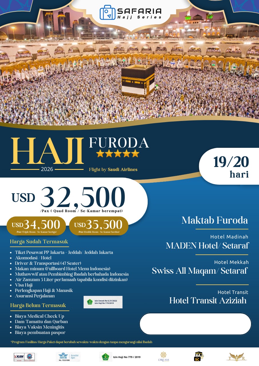 note : - Hari dan Tanggal bersifat estimasi menyesuaikan dengan ketersediaan tiket pesawat. - Program / Fasilitas / Harga Paket dapat berubah sewaktu-waktu dengan / tanpa mengurangi nilai ibadah - Tanggal Masehi dan Hijriah menyesuaikan dengan ketentuan pemerintah KSA.