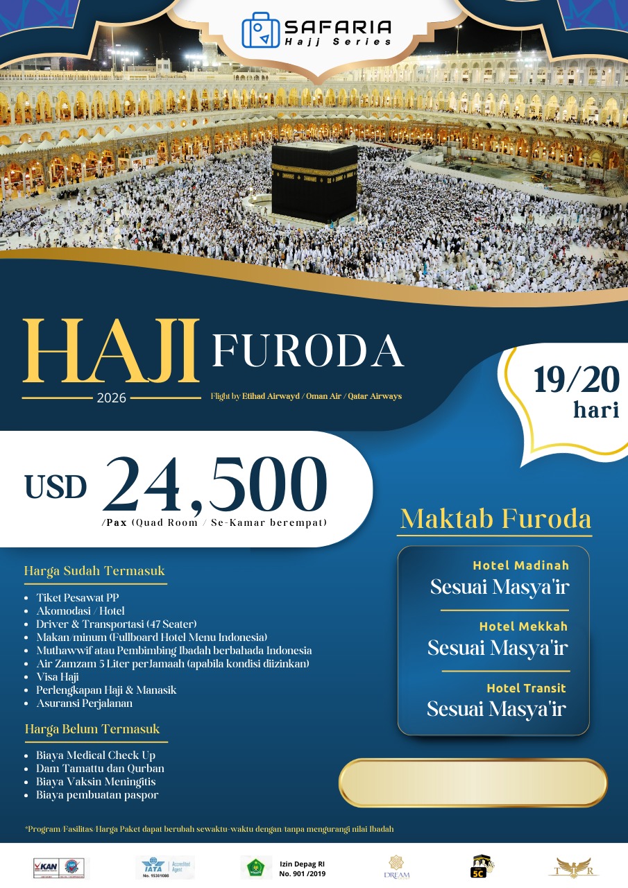 note : - Hari dan Tanggal bersifat estimasi menyesuaikan dengan ketersediaan tiket pesawat. - Program / Fasilitas / Harga Paket dapat berubah sewaktu-waktu dengan / tanpa mengurangi nilai ibadah - Tanggal Masehi dan Hijriah menyesuaikan dengan ketentuan pemerintah KSA.