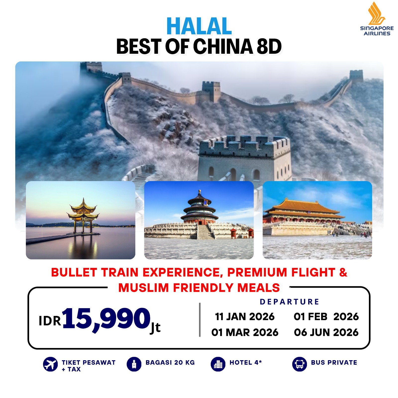Sarapan pagi di hotel. Hari ini kita menuju Beijing menggunakan bullet train. Mengunjungi kunjungan ke Niuji Mosque masjid bersejarah yang terletak di Beijing, Forbidden City kompleks istana dengan struktur kayu kuno terbesar di dunia yang dibangun pada tahun 1407, lalu Check-in hotel dan beristirahat