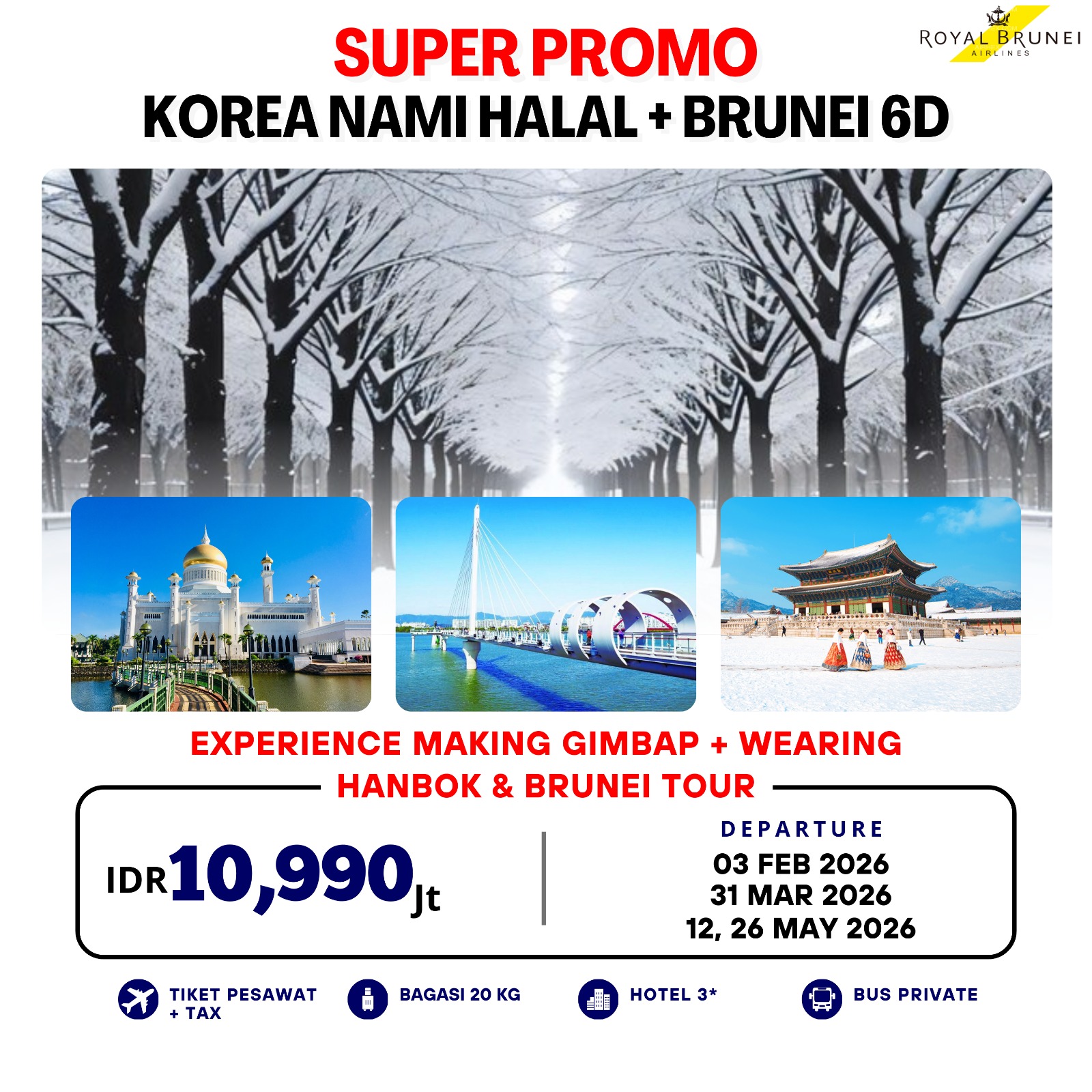 Pagi ini kita berkumpul di Soekarno-Hatta terminal 3-Ultimate untuk berangkat menuju ke Incheon. Sesampainya di Brunei kita akan city tour mengunjungi THE MAJESTIC MASJID OMAR ALI SAIFUDDIEN. Lalu kita akan melewati Prime Minister Office, EDINBURGH PALACE, GOVERNMENT OFFICE COMPLEX, dan BRUNEI LEGISLATIVE COUNCIL BUILDING. Dilanjutkan mengunjungi WATER VILLAGE (termasuk boat). Lalu Photostop di ISTANA NURUL IMAN & JAME ASR HASSANIL BOLKIAH MOSQUE. dan Shopping di GADONG NIGHT MARKET & The Brunei Mall . Setelah itu kita akan diantar kembali ke Airport Brunei untuk keberangkatan menuju Korea Selatan.