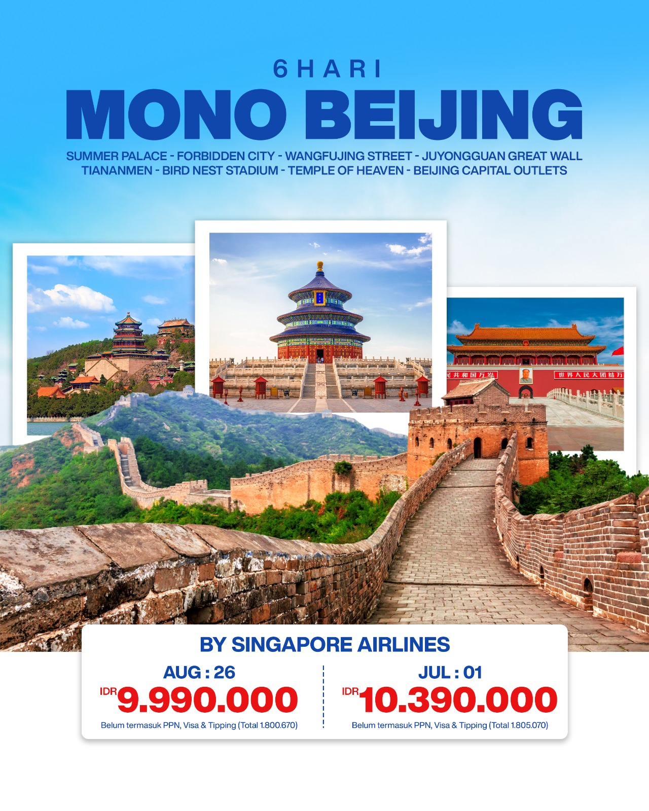 Setelah sarapan, Anda akan mengunjungi Temple of Heaven, yaitu tempat kaisar dahulu memanjatkan doa kepada langit untuk panen yang baik. Lalu Anda akan diantar untuk mengunjungi Beijing Capital Outlets, disana Anda akan mendapatkan waktu bebas yang bisa diisi dengan berbelanja atau mencicipi kuliner lokal. Setelah itu Anda akan diantar menuju ke Bandara untuk melakukan penerbangan kembali ke Jakarta via Singapore.
