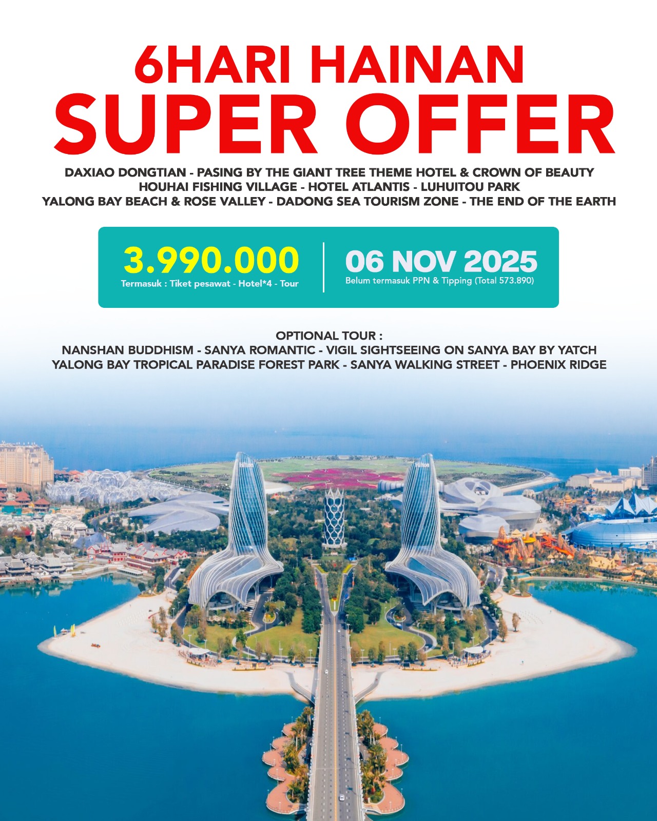 pemandangan tingkat 4A, yang merupakan simbol dari Sanya. Dilanjutkan mengunjungi The End of The Earth (tidak termasuk mobil listrik) Lalu, diantar ke bandara untuk check in penerbangan kembali ke Jakarta.