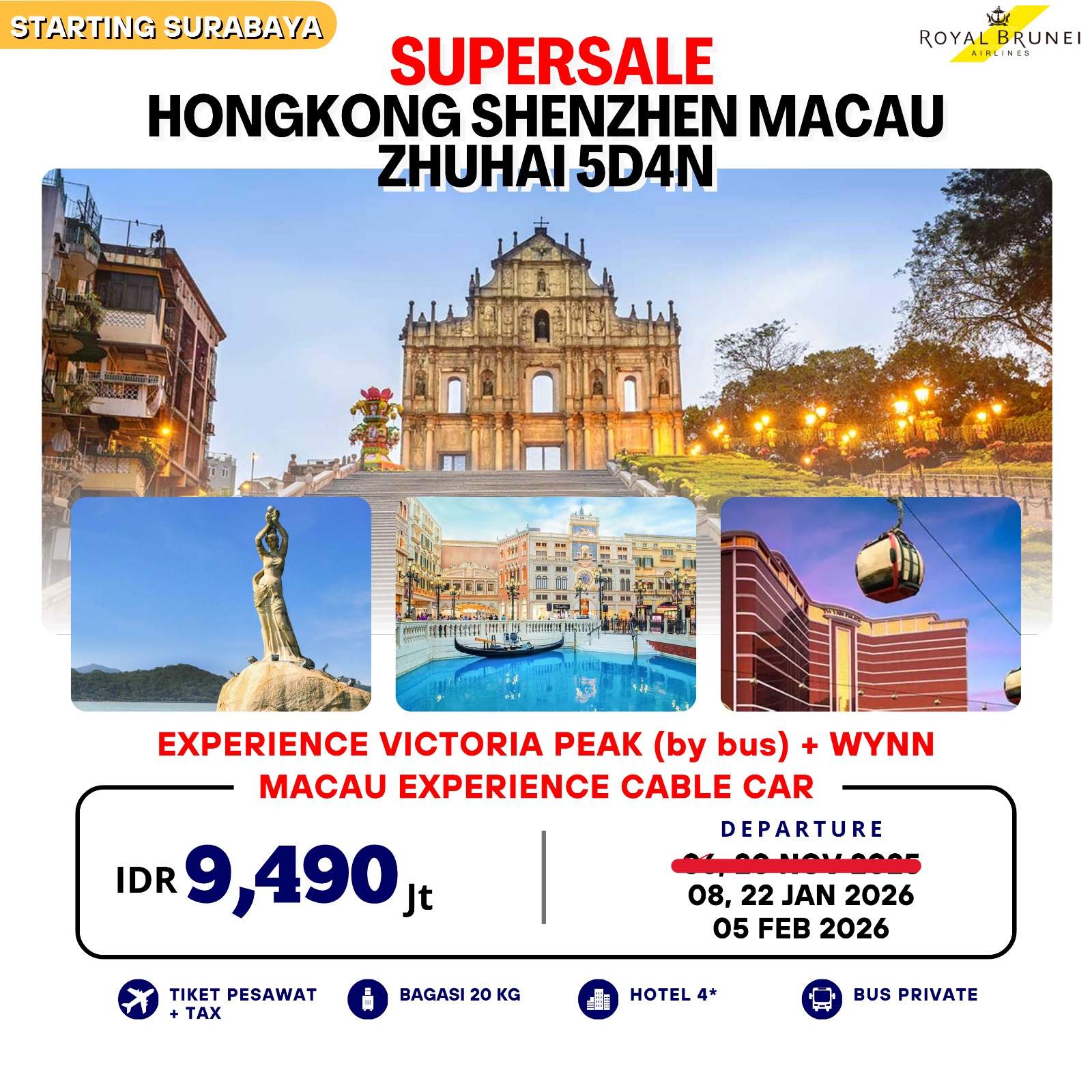 Hari 05 :Day 05 ZHUHAI – HONGKONG – SURABAYA (Makan Pagi) ñ HKG (14.40) - BWN (17.40) by BI || BWN (19.00) - CGK (20.15) by BI