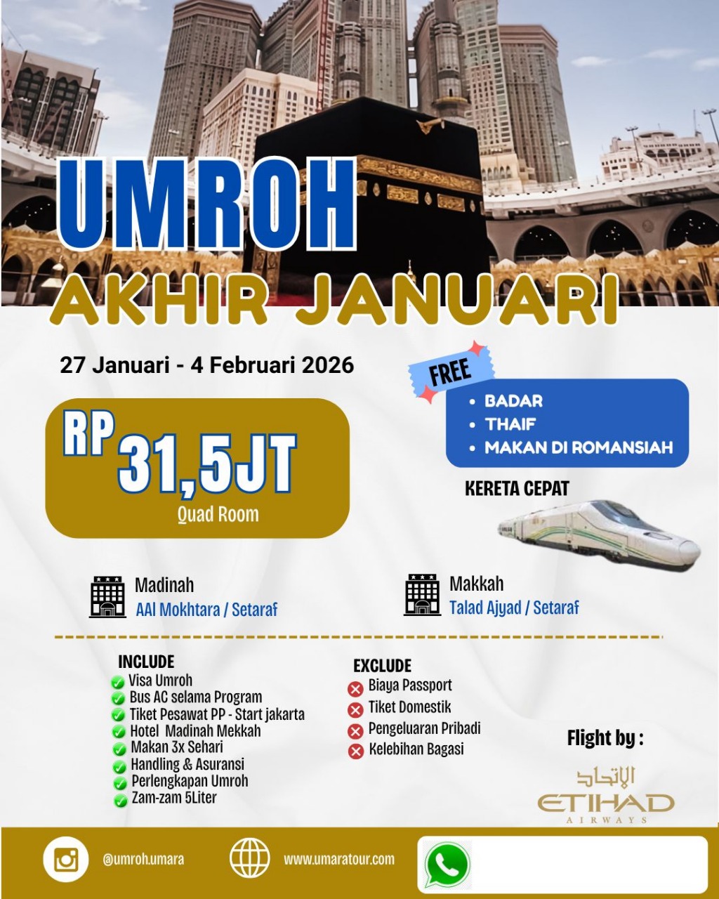 Pukul14:00 Checkout hotel dan persiapan menujuke Mekkah dengan menggunakan Kereta Cepat dengan singgah di BirAli untuk mengambil miqot.lalu menuju Stasiun Kereta Cepat Madinah untuk melanjutkan perjalanan ke mekkah.Setibadi Mekkah, checkin hotel,makan malam,dan persiapan ke Masjidil Haram untuk melaksanakan Ibadah Umroh(Tawaf,Sa'idanTahalul).