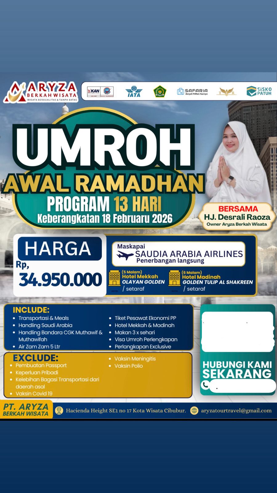 ● Berkumpul di Bandara Soekarno Hatta CGK pukul 06.00 WIB pembagian id card, proses imigrasi, dll. Pesawat SV 817 akan take off pada pukul 10.00 WIB dan Jamaah akan sampai dibandara King Abdul Aziz Jeddah pukul 15.55 WAS ● Jamaah ambil Miqot di Yaa Lam-lam (di atas pesawat 30 menit sebelum landing) atau di Bandara Jeddah ● Selanjutnya perjalanan menuju Makkah. ● Setibanya di Makkah, jamaah check in Hotel dan berbuka puasa, kemudian menyempurnakan umroh dengan Tawaf, Sa’I, dan Tahalul. CGK-JED