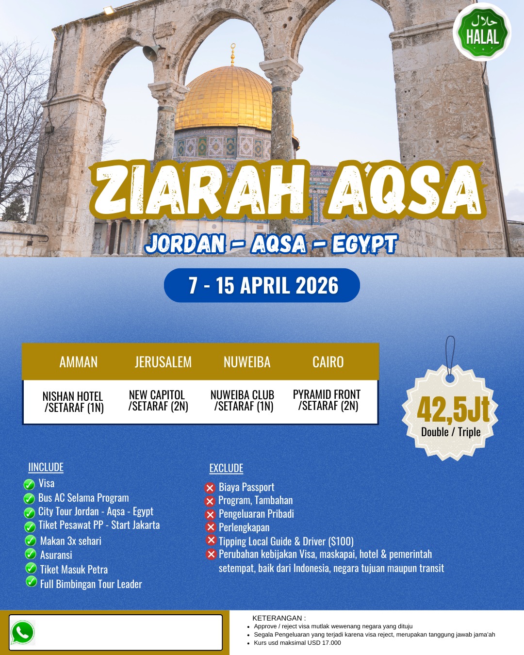 ✓ Tiket Pesawat PP (economy class) ✓ Visa ✓ City Tour Jordan – Aqsa – Egypt ✓ Akomodasi /hotel ✓ Bis selama program ✓ Makan 3x sehari ✓ Tour Leader ✓ Asuransi perjalanan ✓ Tiket masuk Petra